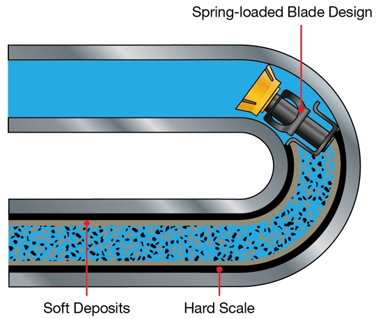康科金属U型管路清洁器使用康科ProSeries管路清洗系统驱动射出,穿过冷凝器或热交换器管路以达到清洗目的。U型管清洁器采用两级设计,带有弹簧加载叶片,以每秒10到20英尺(200-300PSI)的速度穿过管道,清除沉积物,包括微生物污垢、有机垢、障碍物和腐蚀产物。