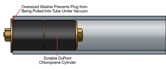 EX-3采用氯丁橡胶密封的两段式设计,具有一个超大垫圈,使管塞与管板平齐安装放置,不会被管路真空吸入到管路内部。