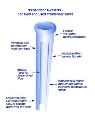 康科Alkaserts®管路插入件广泛应用于发电站、工业发电厂和轮船,避免管路入口端因腐蚀和撞击造成损坏。其设计目的是确保对新管路的入口端进行持久保护,并大大延长因侵蚀或冲击造成损坏并影响管路的使用寿命。Alkaserts®材料的惰性特质使其高度耐磨耐腐蚀,同时,在高于普通冷凝器蒸汽温度的情况下保持尺寸恒定。Alkaserts®具有足够弹性,使其可适应管路的局部变径,但同时又具有足够的刚性,使其便于被插入管路。Alkaserts®的设计使其与管路紧密贴合,从而避免插入件和管道之间渗水的危险。